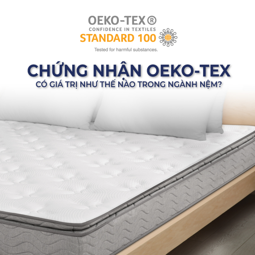 Đây là chứng nhận hàng đầu thế giới về an toàn dệt may. Khi bạn thấy logo này trên vỏ nệm hay lớp lót, hãy yên tâm rằng từng sợi chỉ, từng lớp vải đã được kiểm nghiệm vượt qua hơn 1.000 hóa chất có hại. Nó đảm bảo nệm an toàn tuyệt đối khi tiếp xúc trực tiếp với làn da, kể cả làn da nhạy cảm của em bé.
